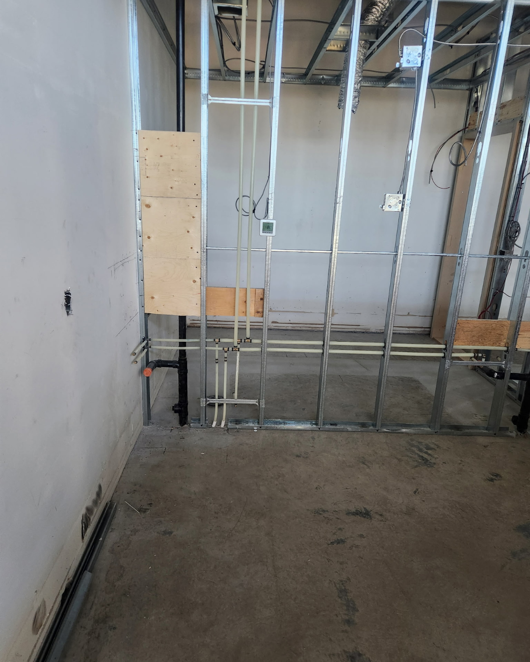 Once that’s done, the project moves into the rough-in stage above the floor: framing penetrations, water distribution, equipment connections (like a tankless unit), and final tie-ins.