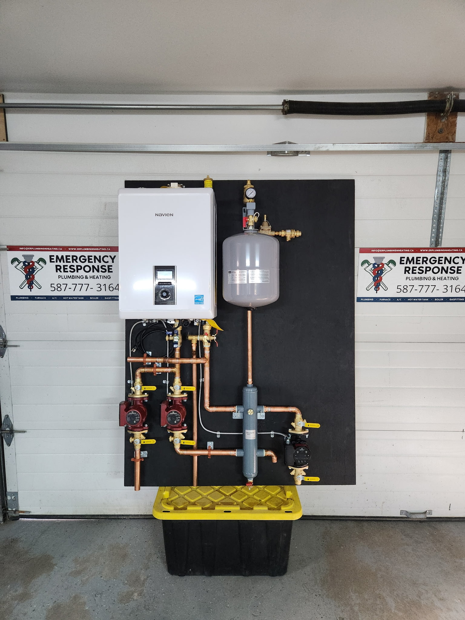 The large white box on the left is a Navien high-efficiency tankless unit (often used as a boiler or combi-boiler).